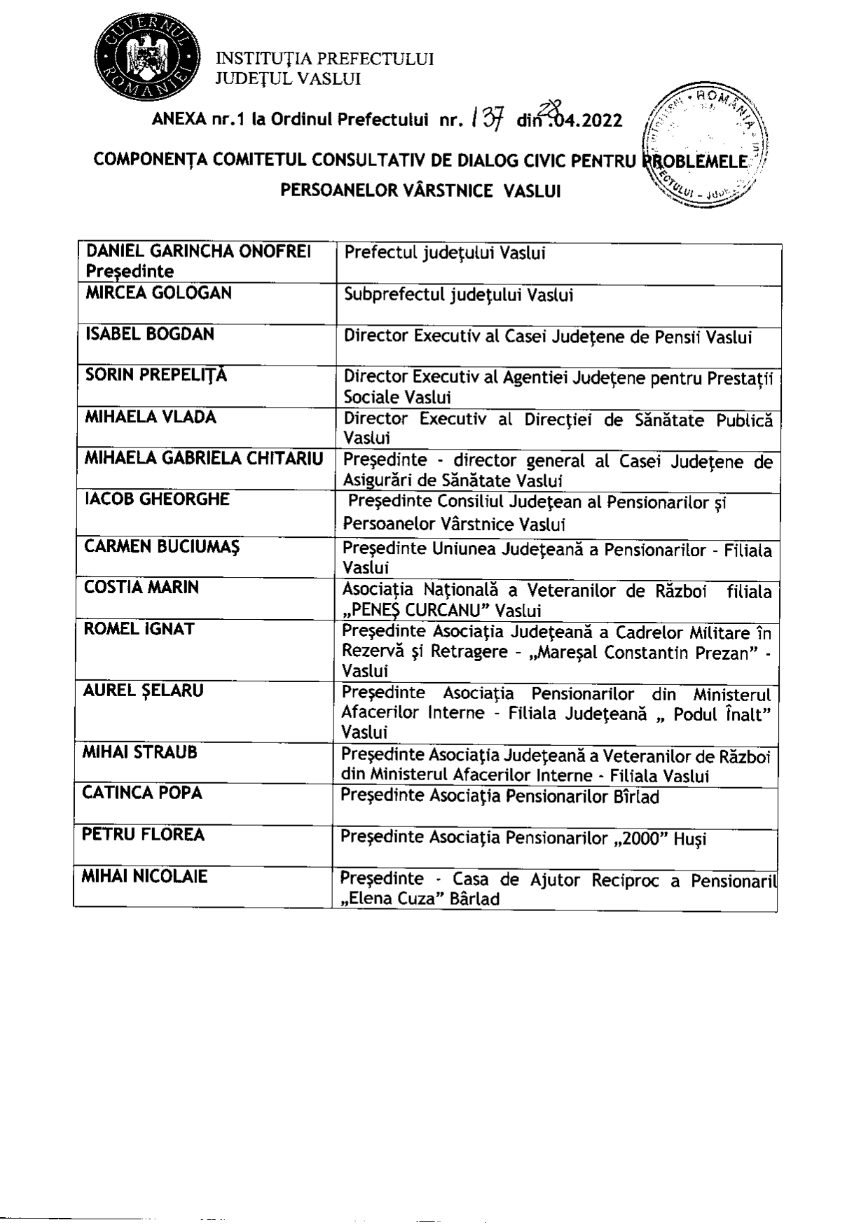 Componența comitetul consultativ de dialog pentru problemele persoanelor vârstnice Vaslui