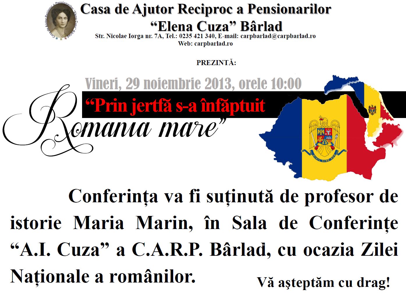 Casa de ajutor reciproc a pensionarilor „Elena Cuza” din Bârlad vă invită miercuri, 6 martie 2013, orele 17, la manifestarea “Femeia în percepția societății și civilizației”, manifestare dedicată zilei de 8 martie (Ziua internațională a femeii ). Tema va fi prezentată de domnul profesor Gruia Novac, în sala “Alexandru Ioan Cuza” din incinta unității. Vă așteptăm cu drag.