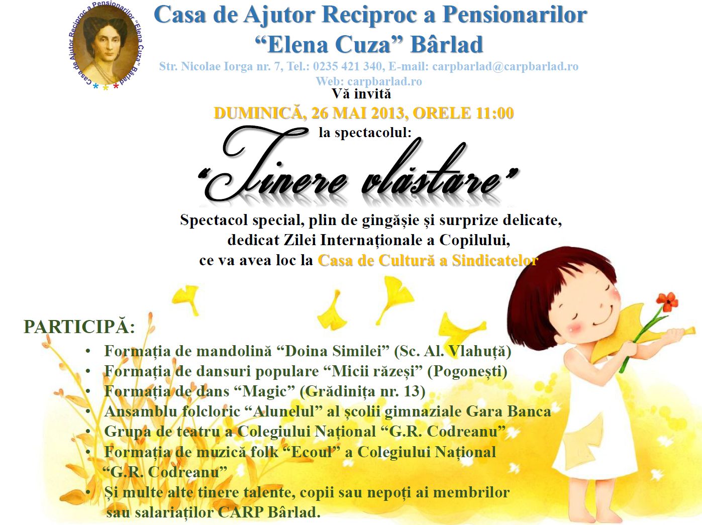 Casa de Ajutor Reciproc a Pensionarilor “Elena Cuza” din Bârlad invită membrii săi la spectacolul teatrului V.I.Popa “Două femei deștepte și nebune, nebune de legat”, pe data de 17 Mai, ora 18.00.