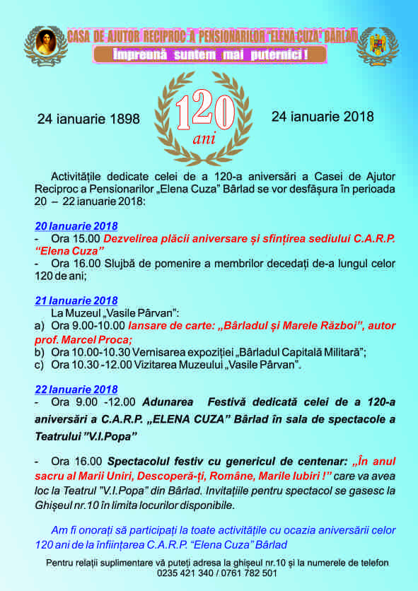 Activitățile dedicate celei de a 120-a aniversări a Casei de Ajutor Reciproc a Pensionarilor Elena Cuza Bârlad se vor desfășura în perioada 20 ianuarie 2018, ora 14.00 22 ianuarie 2018.