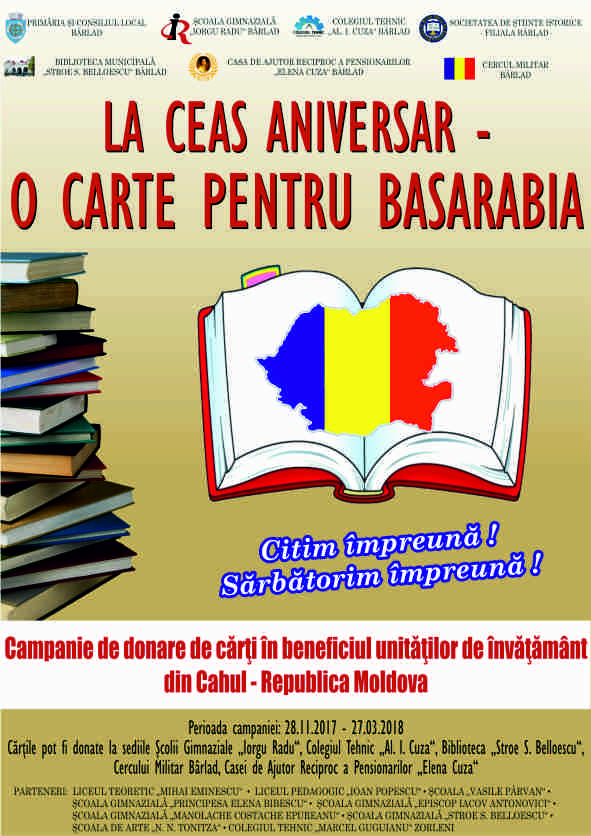 în perioada 28.11.2017 - 27.03.2018 se desfășoară o campanie de donare de cărți în beneficiul unităților de învățământ din Cahul - Republica Moldova. Cărțile se pot dona la sediile școlii Gimnaziale Iorgu Radu, Colegiului Tehnic Al.I. Cuza , Bibliotecii Stroe S. Belloescu,Cercului Militar Bârlad, Casei de Ajutor Reciproc a Pensionarilor Elena Cuza Bârlad