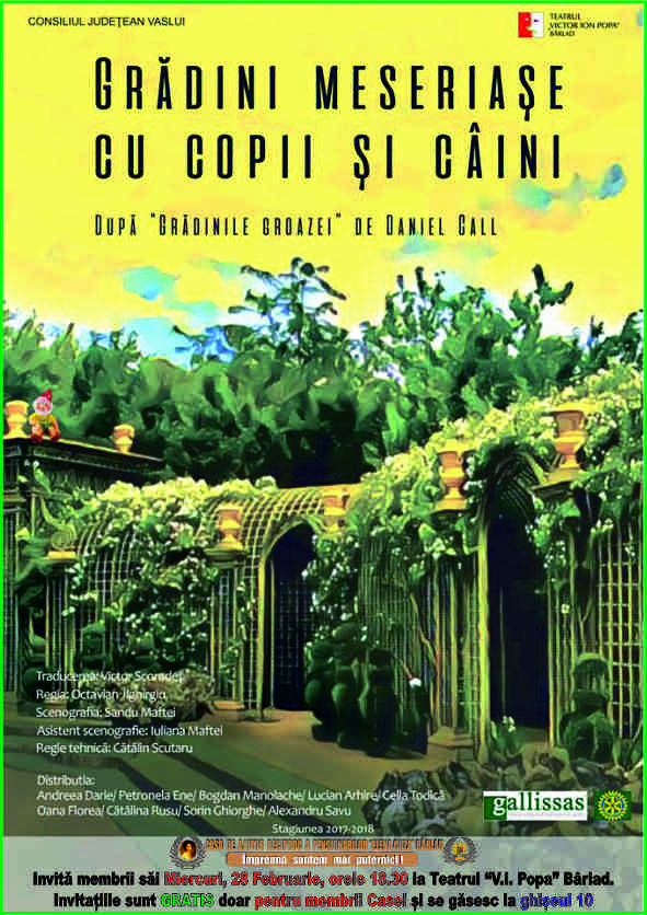Casa de Ajutor a Pensionarilor Elena Cuza din Bârlad vă invită miercuri, 28 februarie, ora 18.30 la Teatrul V. I. Popa să vizionați piesa Grădini meseriașe cu copii și câini, dupa Grădinile Groazei de Daniel Call. Spectacolul este regizat de Octavian Jighirgiu, regizor, dar și actor la Teatrul Național Vasile Alecsandri, Iași. Scenografia - Sandu Maftei. Grădinile groazei este un text care aparține dramaturgului german Daniel Call, în traducerea lui Victor Scoradeț, în care întâlnim două cupluri Sonni Esser (Andreea Darie - studentă la Universitatea Națională de Arte George Enescu, Iași) și Sigi Esser (Bogdan Manolache), alături de fratele lui Sigi, Friedo (Lucian Arhire) și soția sa, Frieda (Petronela Ene). Sonni și Sigi Esser se instalează la țară, în vecinătatea fratelui lui Sigi, Friedo. Ea (Sonni) e pasionată de modă, snoabă și artificială; el (Sigi) este pasionat până la obsesie de chimie și speră...