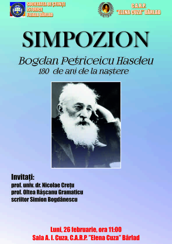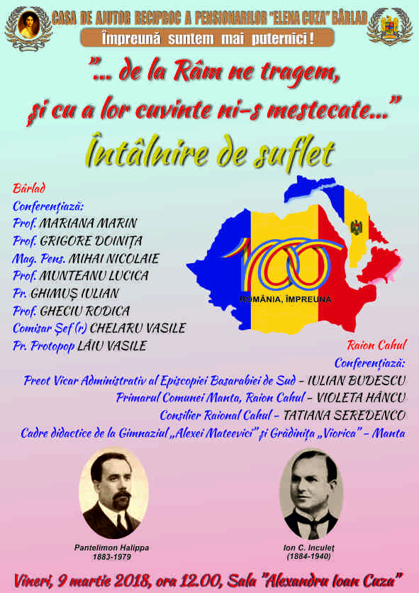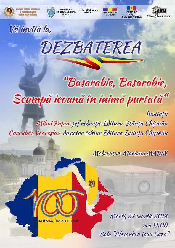 C.A.R.P. Elena Cuza Bârlad vă invită la dezbaterea: Basarabie, Basarabie, Scumpă icoană în inimă purtată, ce va avea loc marți. 27 martie 2018, ora 11.00 în sala Al. I. Cuza a Casei.