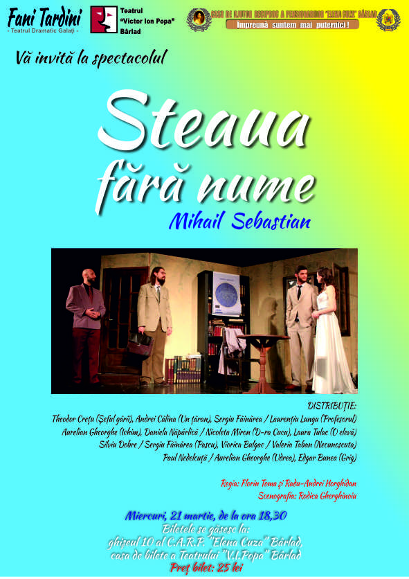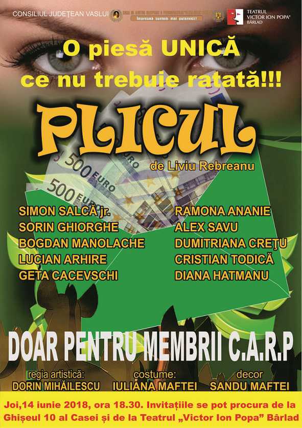 C.A.R.P. "Elena Cuza" Bârlad vă invită să vizionați o piesă de teatru extraordinară, unică, a marelui scriitor Liviu Rebreanu. Invitațiile se găsesc la ghișeul nr. 10 al Casei și la Teatrul "Victor Ion Popa" din Bârlad. Doar pentru membrii noștri!!!