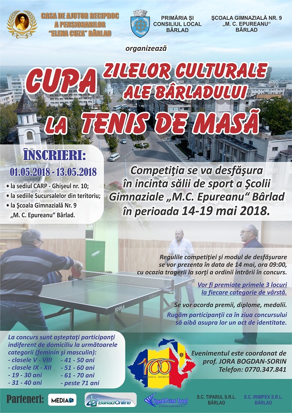 Casa de Ajutor Reciproc a Pensionarilor Elena Cuza din Bârlad vă invită să participați la concursul de tenis de masă, din cadrul Cupei Zilelor Culturale ale Bârladului, ce se va desfășura în perioada 14-19 mai!