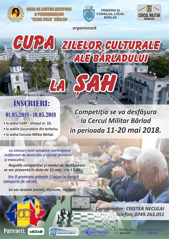 Casa de Ajutor Reciproc a Pensionarilor Elena Cuza din Bârlad vă invită să participați la concursul de șah, din cadrul Cupei Zilelor Culturale ale Bârladului, ce se va desfășura în perioada 11-20 mai!