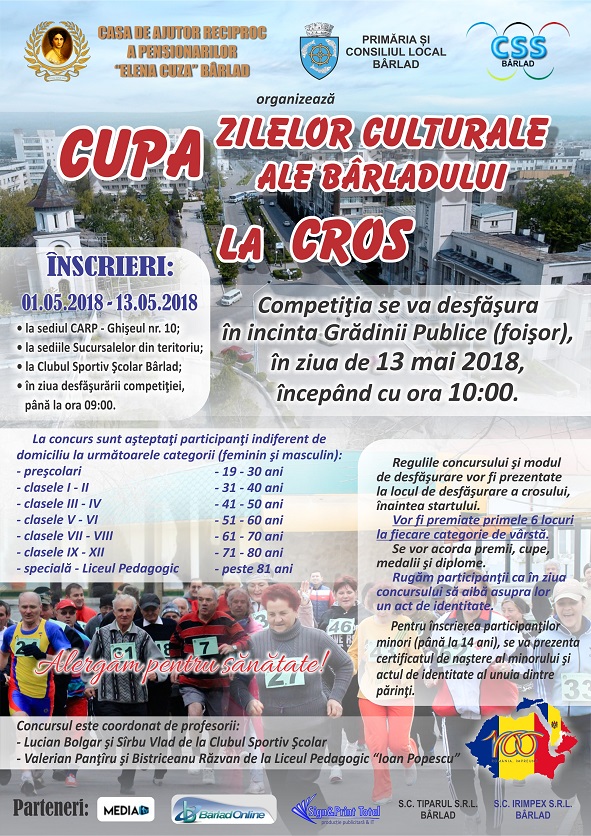 Casa de Ajutor Reciproc a Pensionarilor Elena Cuza din Bârlad vă invită să participați la concursul de cros, din cadrul Cupei Zilelor Culturale ale Bârladului, ce se va desfășura la data de 13 mai începând cu ora 10.00!