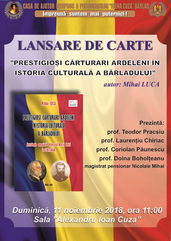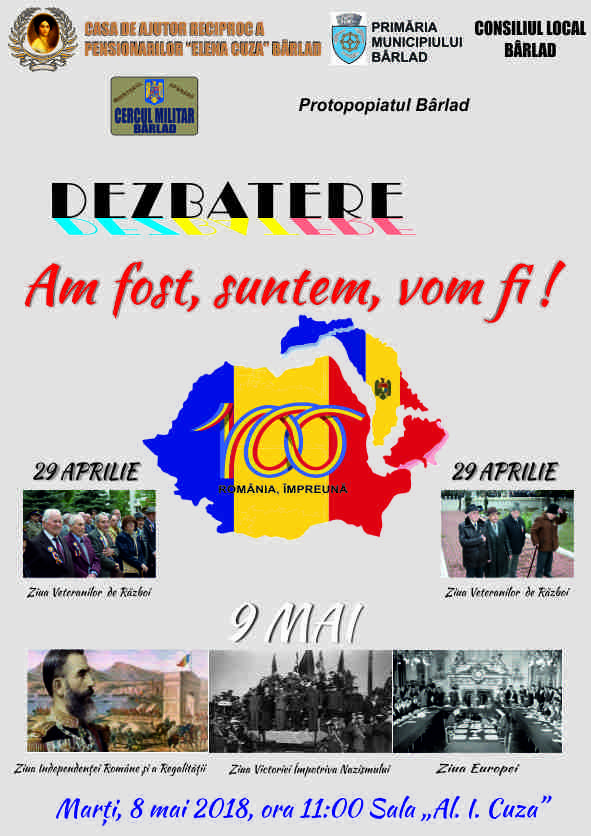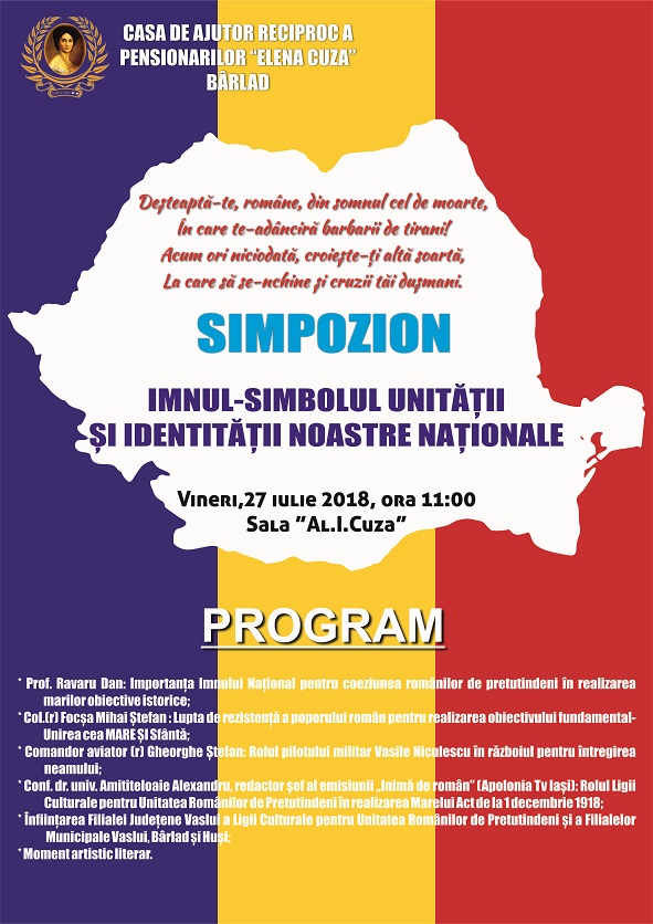Casa de Ajutor Reciproc a Pensionarilor Elena Cuza din Bârlad vă invită vineri, 27 iulie 2018, ora 11.00 la simpozionul IMNUL-SIMBOLUL UNITĂȚII ȘI IDENTITĂȚII NOASTRE NAȚIONALE