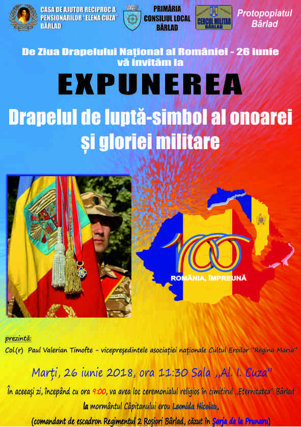 Casa de Ajutor Reciproc a Pensionarilor Elena Cuza Bârlad vă invită la expunerea: Drapelul de luptă-simbol al onoarei și gloriei militare. Evenimentul va avea loc marți, 26 iunie 2018, ora 11.30, în sala Al. I . Cuza.