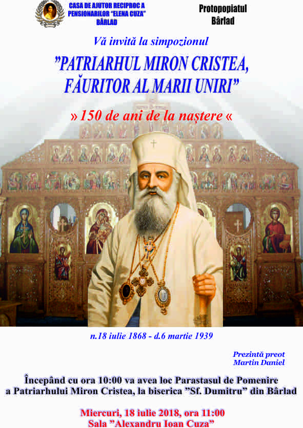 Miercuri, 18 iulie 2018, începând cu ora 10.00 va avea loc Slujba de Pomenire a Patriarhului Miron Cristea la Biserica Sf. Dumitru, Bârlad. De la ora 11.00, în sala Al. I. Cuza a C.A.R.P. Elena Cuza din Bârlad va avea loc simpozionul Patriarhul Miron Cristea, Făuritor al Marii Uniri.
