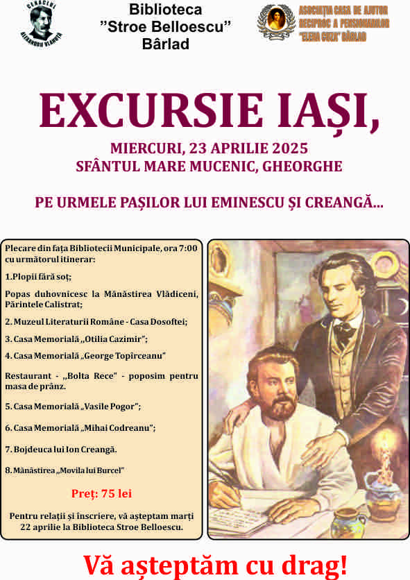 Colectivul Asociației Casa de Ajutor Reciproc a Pensionarilor „Elena Cuza” din Bârlad invită membrii săi miercuri 23 aprilie de sărbătoarea religioasă a Marelui Mucenic Gheorghe la o atractivă excursie de o zi la Iași pe urmele clasicilor literaturii române Eminescu și Creangă.