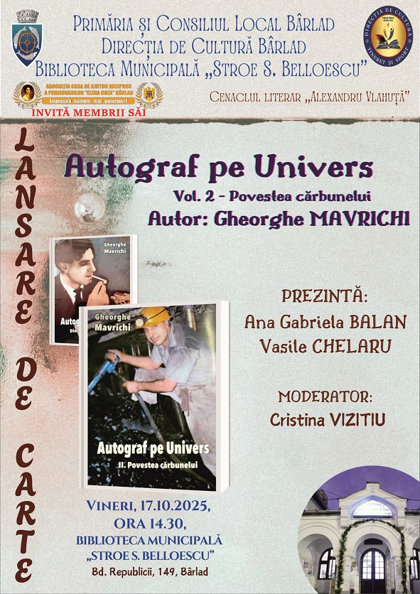 Vă invităm să fiți alături de membrul și colaboratorul nostru, domnul Gheorghe Mavrichi, la Biblioteca „Stroe S. Belloescu”, vineri, 17 octombrie, începând cu ora 14.30, unde își va lansa cel de-al doilea volum al cărții „Autograf pe Univers”.