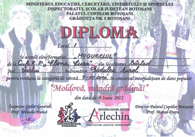 Formatia de dansuri populare Mugurelul, coordonata de coregraful Aurel Gudulea, a obtinut locul I la concursul interjudetean de dansuri populare organizat pe 9 iunie 2012 la Botosani.
