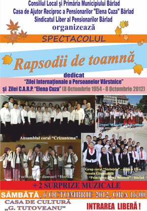 Sambata 6 Octombrie 2012, ora 16.00 la Casa de Cultura "George Tutoveanu" din Barlad a avut loc spectacolul "Rapsodii de toamna"