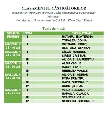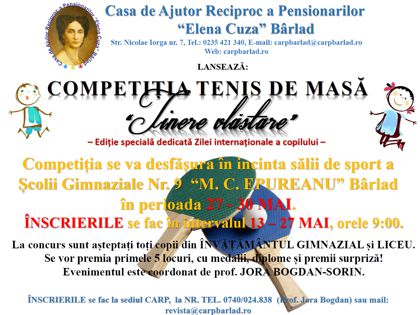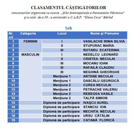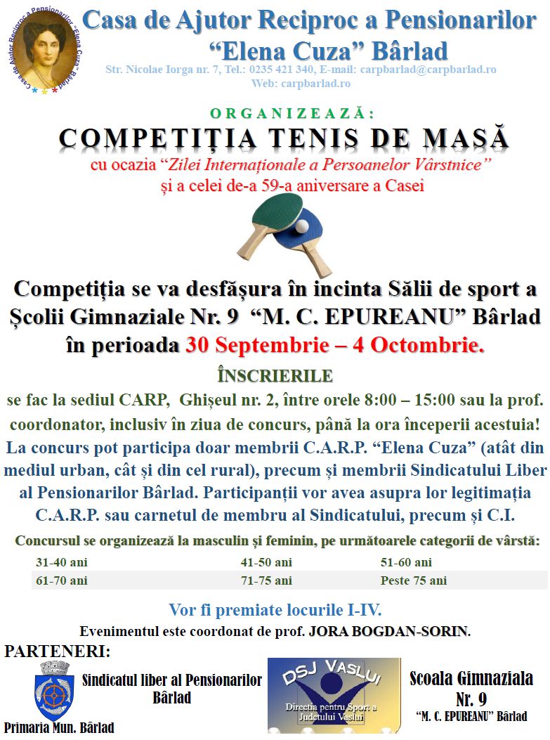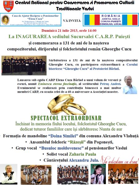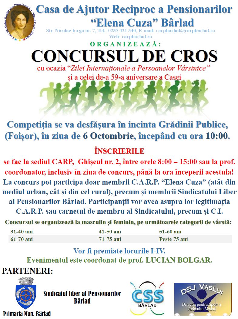 Cu ocazia Zilei Internaționale a Persoanelor Vârstnice (1 Octombrie) și a Zilei Asociației noastre (8 Octombrie) vor fi sărbătorite acele cupluri, membre ale C.A.R.P. "Elena Cuza" Bârlad, care în acest an împlinesc 50 de ani de la căsătorie. Rugăm aceste cupluri să se prezinte în perioada 19 Martie - 30 Septembrie la sediul nostru din Bârlad sau la sediul sucursalelor din teritoriu pentru a fi luate în evidență pe baza următoarelor înscrisuri și documente: carnetul de membru al fiecărui soț, certificatul de căsătorie și B.I. sau C.I. al fiecărui soț.