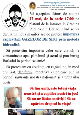 Vă așteptăm alături de noi pe 27 mai, de la orele 17:00 pe platoul de la intrarea în Grădina Publică din Bârlad, cănd se va derula o nouă manifestare de protest împotrivaexploatării GAZELOR DE ȘIST prin metoda hidraulică.