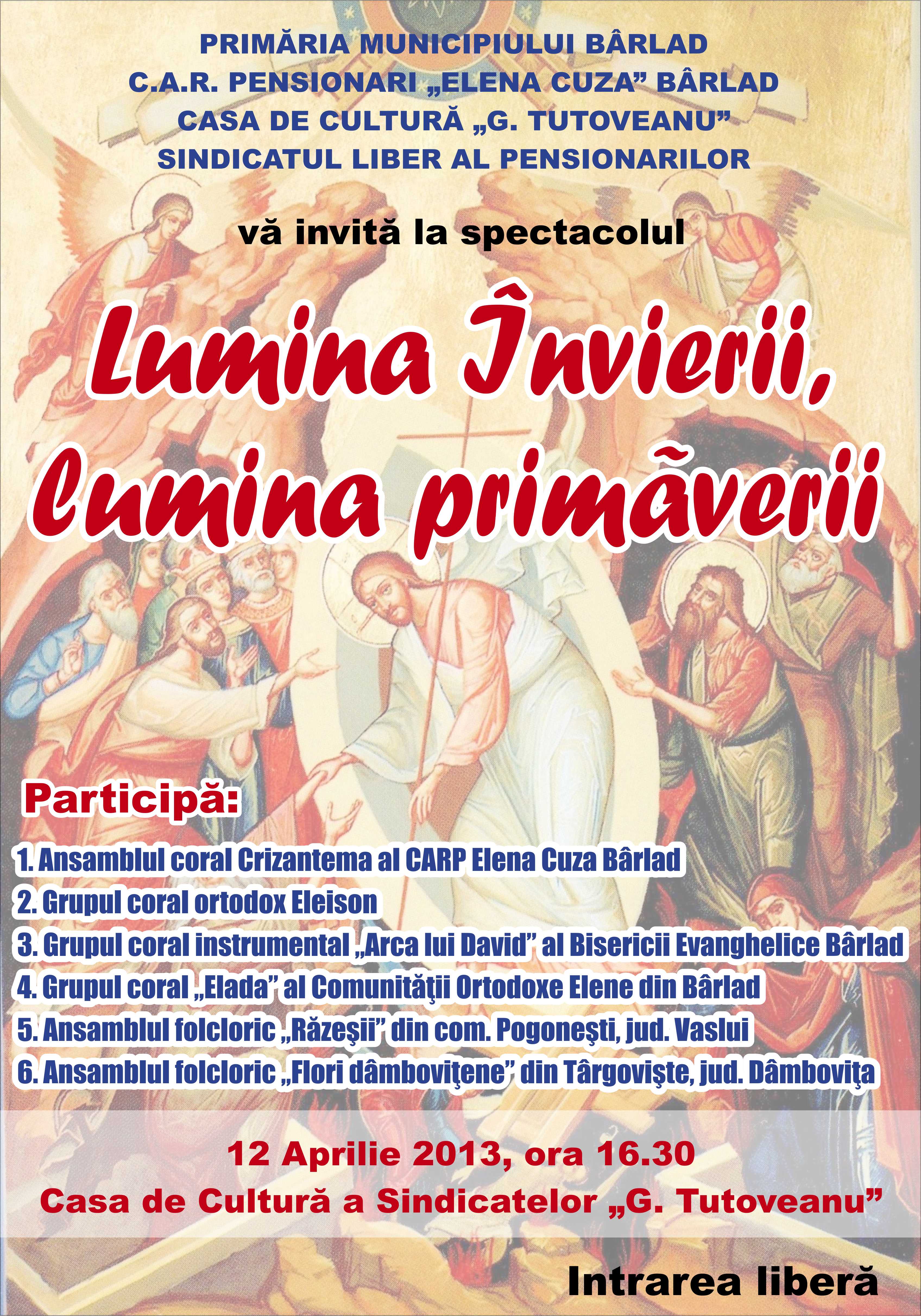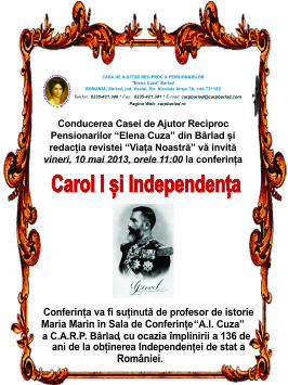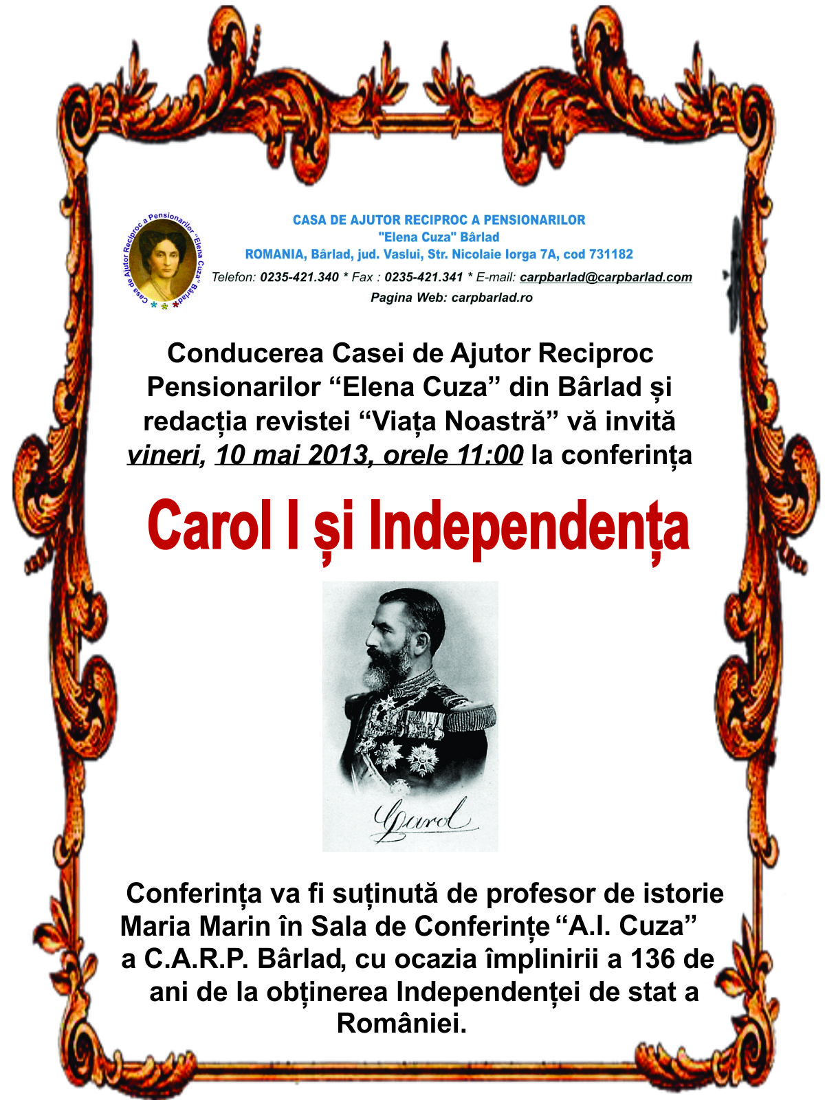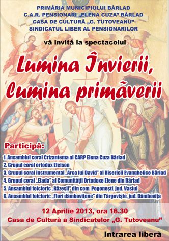 Casa de Ajutor Reciproc a Pensionarilor “Elena Cuza” din Bârlad vă invită sâmbătă, 27 aprilie 2013, ora 11.00, la ceremonia de lansare a cărții scriitoarei Dorina Stoica, “De Florii în Țara lui Iisus”. Evenimentul va fi prezentat de profesorul Serghei Coloșenco și scriitorul Andrei-Nicolae Mihai. De asemenea, cu ocazia acestui eveniment, Casa are plăcerea de a vă invita și la lansarea celui de-al 11-lea număr al revistei C.A.R.P. Bârlad “Viața noastră”, primul număr pe acest an, dedicat Zilei Mamei, Floriilor și Sfintelor Paști. Evenimentul va fi finalizat cu o surpriză… “enigmatică”!