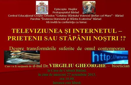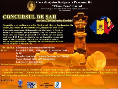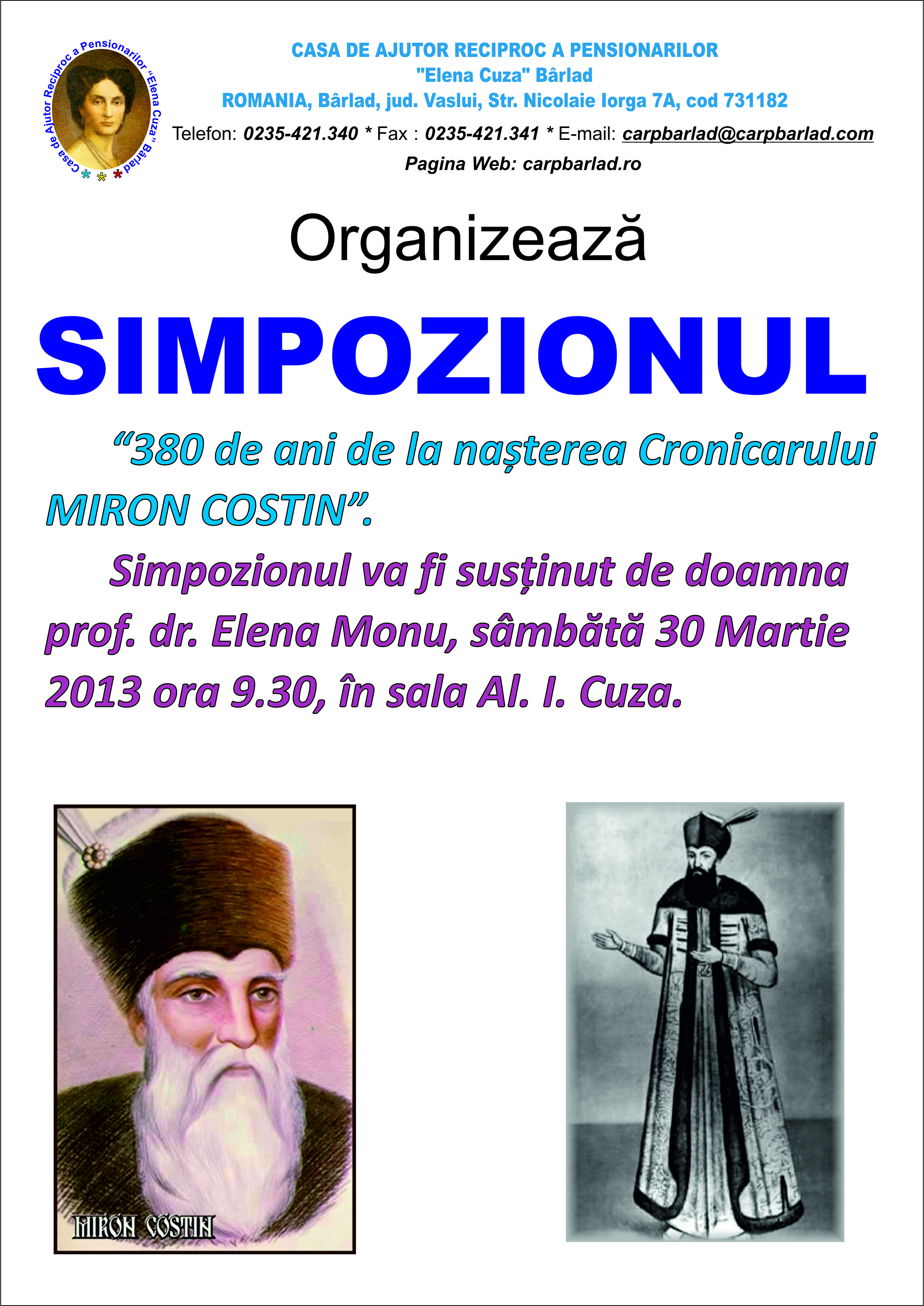 Casa de ajutor reciproc a pensionarilor „Elena Cuza” din Bârlad vă invită miercuri, 6 martie 2013, orele 17, la manifestarea “Femeia în percepția societății și civilizației”, manifestare dedicată zilei de 8 martie (Ziua internațională a femeii ). Tema va fi prezentată de domnul profesor Gruia Novac, în sala “Alexandru Ioan Cuza” din incinta unității. Vă așteptăm cu drag.