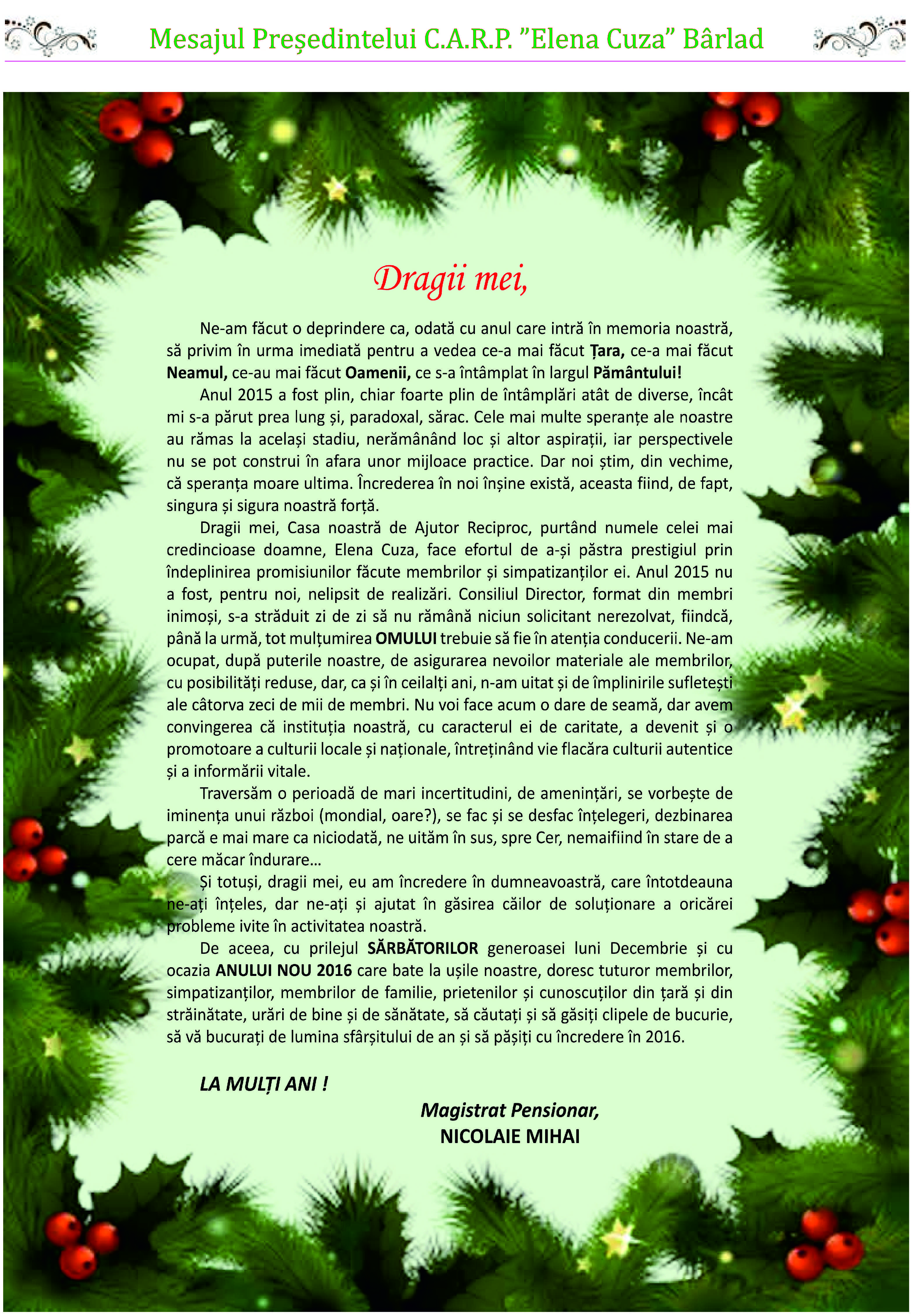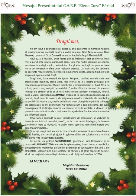 Magistr. (pens.) Nicolaie MIHAI Președintele C.A.R.P. „Elena Cuza” Bârlad