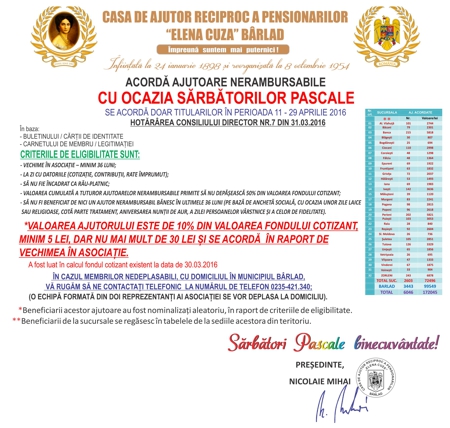 Ajutoare nerambursabile acordate cu ocazia Sărbătorilor Pascale: