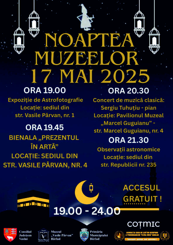 Invită membrii săi la Noaptea Muzeelor 2025 Cu bucurie vă invităm să participați la Noaptea Muzeelor 2025, o seară specială dedicată culturii, artei și științei, în care porțile Muzeului „Vasile Pârvan” se deschid larg pentru toți vizitatorii ! -“… Sâmbătă, 17 mai 2025 | – 19:00 – 24:00 - VIZITAREA TUTUROR EXPOZIȚIILOR PERMANENTE ȘI TEMPORARE ORGANIZATE LA CELE 4 SEDII ALE MUZEULUI „VASILE PÂRVAN” Programul serii: – Ora 19:00 – Sediul central, str. Vasile Pârvan nr. 1 “¸ VERNISAJ: Expoziție de Astrofotografie – astronomul clujean Ștefan Pop Coț vă propune o incursiune vizuală în univers, cu imagini spectaculoase surprinse în ultimii 8 ani. – Ora 19:45 – Casa Sturdza, str. Vasile Pârvan nr. 4 Bienala tinerilor artiști – „Prezentul în Artă” Tema: „Intersecția dintre tradiție și modernitate” Participă studenți, masteranzi și doctoranzi din întreaga țară. — Ora 2...