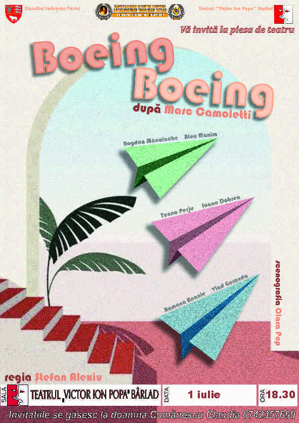Avionul Boeing aterizează, din nou, Marți - 1 iulie, la ora 18,30 la Teatrul V.I.Popa din Bârlad și vă așteaptă să vă umpleți bagajele cu talentul, frumusețea și energia celor șase actori: Bogdan Manolache, Teona Perju, Vlad Goranda, Alexandru Maxim, Ioana Dobrea și Ramona Ananie. Regia: Ștefan Alexiu Scenografia: Clara Pop Vă așteptăm cu drag!