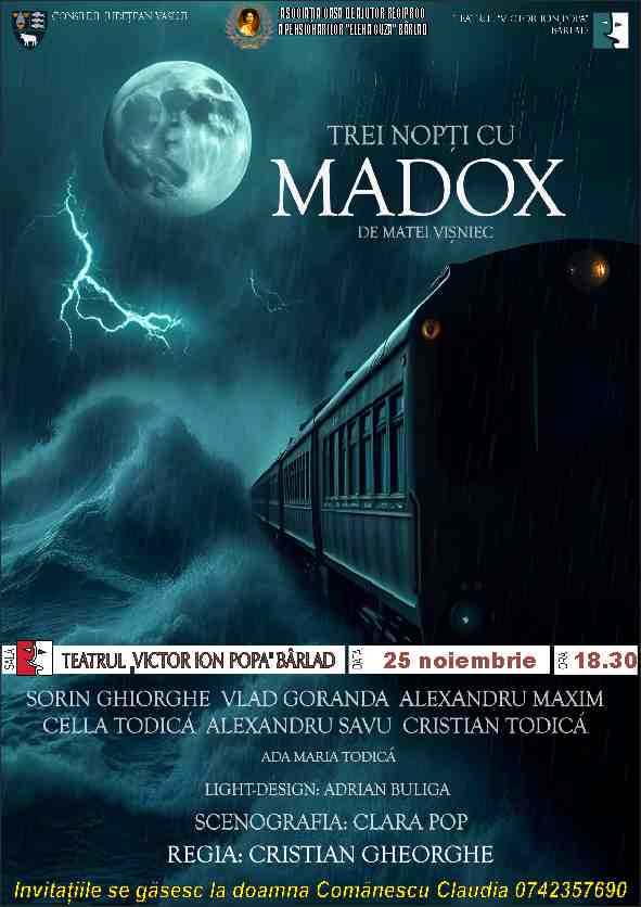 ”Șase personaje sunt în căutarea sensului propriilor existențe. Ele așteaptă și speră că salvarea va veni odată cu apariția acestui straniu Madox, despre care nu știu decât că spune aceleași povești și că apare în mai multe locuri în același timp. Cu toții se raportează la acesta – când comic, când tragic – ca la Mesia cel mult dorit, sperând că îi va scoate, cu siguranță, din locul cenușiu și întunecat, unde plouă de trei zile. Doar el îi poate lumina, doar el îi poate ajuta să evadeze din nimicul în care se scaldă, din monotonia vieții. Misterul acestor șase destine, bulversate total de apariția celui ce le dă sens, ni se dezvăluie la final, când aflăm… cine este Madox. Spectacolul este o poveste despre singurătățile și vulnerabilitățile noastre, despre cât suntem de dispuși să pierdem sau până unde să mergem atunci când aflăm că am pierdut; e o poveste despre aceasta ”viermuială” numită viață, căreia r...