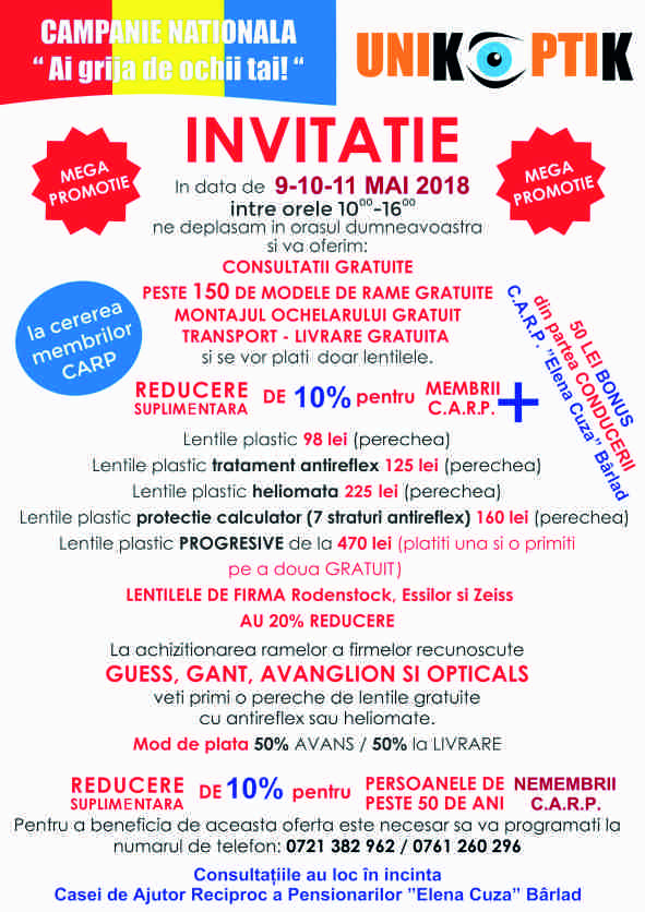 Casa de Ajutor Reciproc a Pensionarilor "Elena Cuza" din Bârlad vă invită la programul artistic-literar "Onoare,Cinstire, Recunoștință Hainei Militare și Eroilor Națiunii Unite!!!", ce se va desfășura în Sala Mare a Cercului Militar Bârlad, marți, 23 octombrie, ora 17.00. Vă așteptăm cu drag!