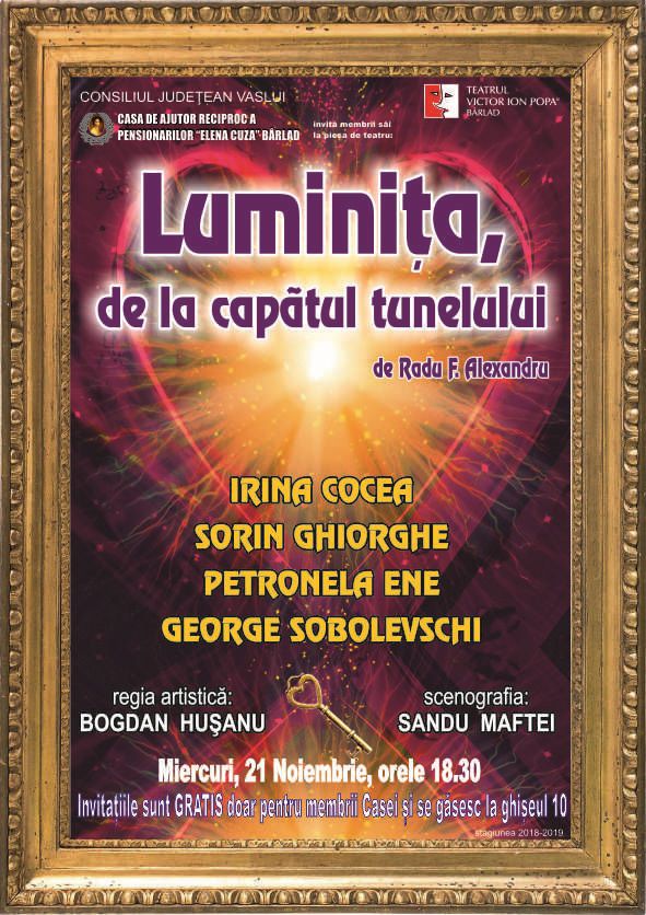 C.A.R.P. "Elena Cuza" Bârlad vă invită să vizionați o piesă de teatru extraordinară, unică, a marelui scriitor Liviu Rebreanu. Invitațiile se găsesc la ghișeul nr. 10 al Casei și la Teatrul "Victor Ion Popa" din Bârlad. Doar pentru membrii noștri!!!