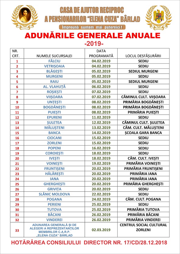 Activitățile dedicate celei de a 120-a aniversări a Casei de Ajutor Reciproc a Pensionarilor Elena Cuza Bârlad se vor desfășura în perioada 20 ianuarie 2018, ora 14.00 22 ianuarie 2018.
