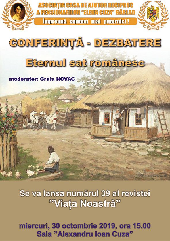 Conferința-dezbatere „Eternul sat românesc”, ce a avut loc miercuri, 30 octombrie, în incinta Casei de Ajutor Reciproc a Pensionarilor ,,Elena Cuza’’, sala „Al. I. Cuza”, a fost dedicată, după cum putem observa încă din titlu, Satului Românesc. Putem spune că motivul pentru dezvoltarea unei expuneri pe această temă este cu atât mai întemeiat cu cât anul 2019 a fost declarat ,,An omagial al satului românesc (al preoților, învățătorilor și primarilor gospodari)’’. Deoarece o simplă expunere nu ar fi fost suficientă pentru a acoperi bogăția informației legată de acest subiect, redacția revistei Casei - ,,Viața Noastră’’ - a hotărât să dedice numărul 39 Satului Românesc. Cu prilejul acestei conferințe a avut loc și lansarea acestui exemplar, însoțit de revista rebus Crypto și un calendar pentru anul 2020 ce cuprinde ziceri și proverbe românești. Așa cum afirma președintele Asociației, Mihai Nic...