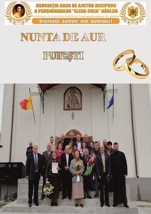 Duminică, 20 octombrie 2019, la biserica cu hramurile „Sf. Nicolaie” și „Sf. Cuvios Visarion Sarai” din localitatea Puiești, județul Vaslui, Asociația Casa de Ajutor Reciproc a Pensionarilor „Elena Cuza” din Bârlad și-a sărbătorit cuplurile membre care au împlinit 50 de ani de la căsătorie. Președintele Casei, Mihai Nicolaie împreună cu Responsabilul Sucursalei Puiești, Eugen Radu au fost nașii celor 6 cupluri aniversate. Slujba religioasă a fost oficiată de părintele paroh Alexandru Vasile și de dascălul Gheorghe Cucu. La final, din partea Asociației s-au acordat diplome aniversare, medalii și câte un ajutor nerambursabil în valoare de 50 de ron. Cuplurile sărbătorite anul acesta: - Carp Aurel și Adela: - Neagu Ioan și Viorica; - Opria Gheorghe și Georgeta; - Ocraim Vasile și Aurica; - Coștoi Ion și Maria; - Hriscu Neculai și Valerica.