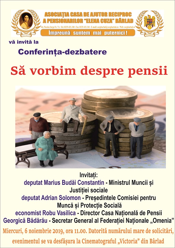 Asociația Casa de Ajutor Reciproc a Pensionarilor ,,Elena Cuza’’ din Bârlad, din dorința de a asigura contactul direct cu legiuitorii în ceea ce privește problemele vârstei a treia, a organizat o conferință în jurul situației pensiilor. Invitații, deputatul Marius Budăi Constantin, fostul Ministru al Muncii și Justiției Sociale și deputatul Adrian Solomon, președintele Comisiei pentru Muncă și Protecție Socială, au stat la dispoziția publicului pentru a clarifica toate problemele legate de pensii și pentru a lămuri care vor fi viitoarele modificări ce vor influența calcularea lor. Din caza unor probleme apărute în ultimul moment, economistul Robu Vasilică – Director la Casa Națională de Pensii și Georgică Bădărău - Secretarul General al Federației Naționale „Omenia” nu au putut fi prezenți la eveniment. Bazele sistemului de securitate socială din România au fost puse înainte de Primul Război Mondia...
