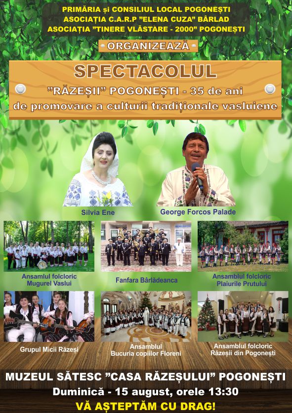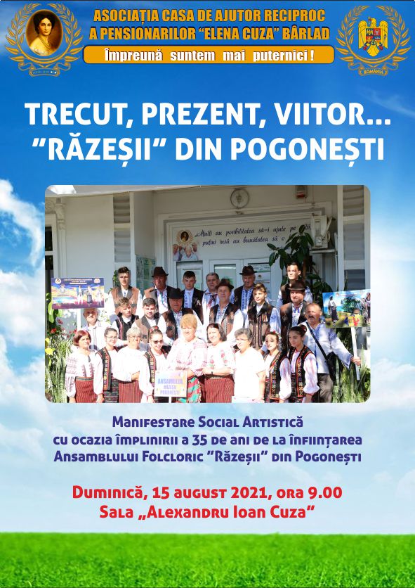 Dragi colaboratori, membri ai ansamblului folcloric ,,Răzeșii” de la Pogonești, La 35 de ani de când promovați tezaurul popular de la Pogonești și din zonă, ținem să vă mulțumim pentru frumoasa și fructuoasa noastră colaborare și vă dorim să fiți sănătoși, puternici, români adevărați, stejari de neclintit în fața furtunii culturii neomoderniste și să fiți și mai talentați pentru a valorifica mai departe comorile culturale românești, portul popular, datinile și obiceiurile străvechi, păstrate cu grijă și mare drag de generații de-a rândul, tezaur românesc adevărat ce ne definește ca neam și să insuflați și tinerilor aceste valori pentru a nu ne pierde rostul nostru ca popor și identitatea noastră națională! Dacă ani la rând ne-ați urat la geam frumoasele dumneavoastră colinde, sorcove și urături, astăzi este de datoria noastră să vă urăm viață lungă, inspirație...